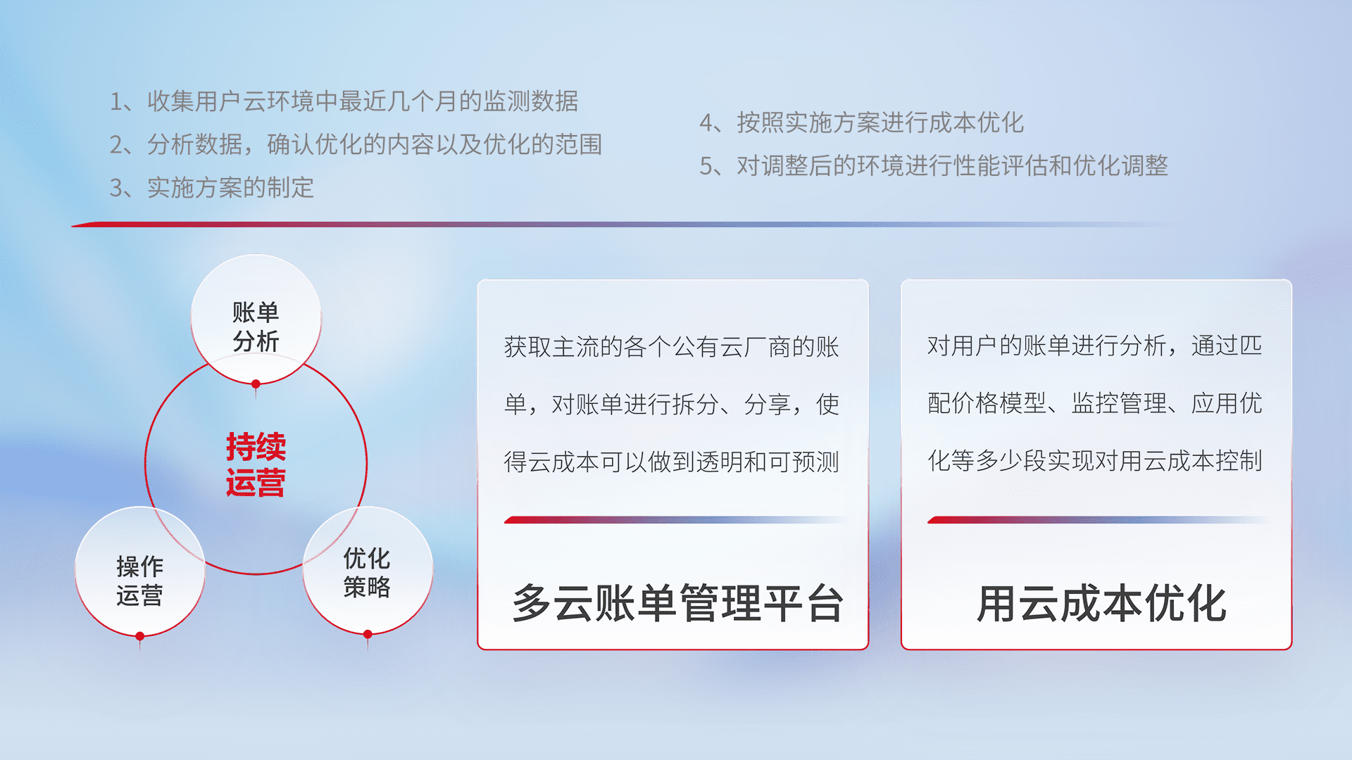 通过多云纳管,,以统一的资源数据模型把客户的云资源进行抽象和封装,,进而实现对多云资源的统一操作,,,,保障云资源管理的可靠性、、、稳定性与可用性。。。量身定制化运维内容,,配置、、、开发运维、、补丁管理、、备份、、、监控、、、认证和访问管理、、审计和日常巡检等,,保障在用云过程中的可靠度,,,稳定度以及高可用率。。